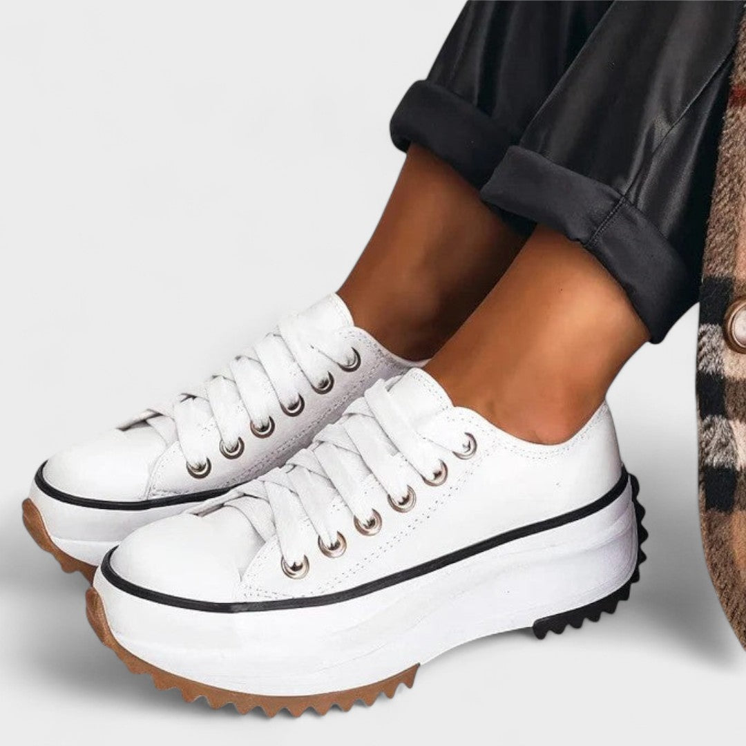 Ces baskets blanches à plateforme et semelle crantée sont la combinaison parfaite de mode et de fonctionnalité. Conçues pour apporter de la hauteur, du confort et un look moderne, elles deviennent le complément idéal pour vos tenues décontractées ou urbaines.