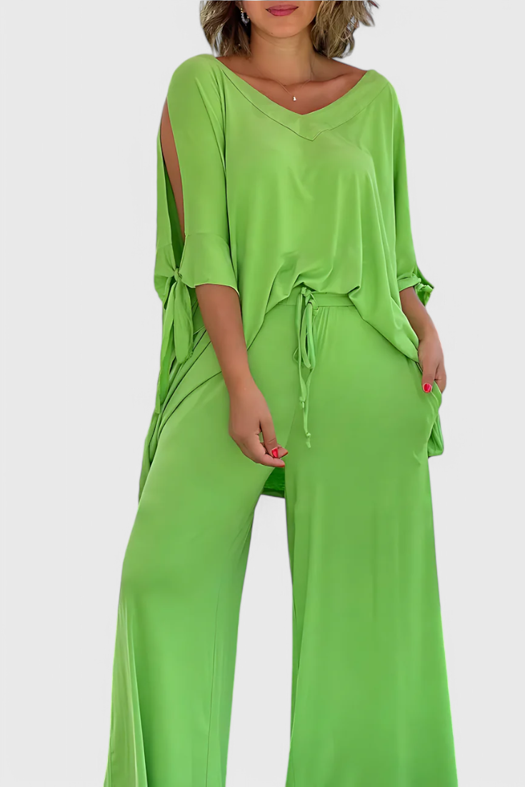 Un look sûr que vous adorerez porter. L'ensemble Cecilia combine un haut à épaule découverte avec un pantalon à coupe décontracté assorti, offrant un mélange de douceur féminine et une touche moderne. Conçu pour le confort et le style quotidien, cet ensemble s'adapte à vous depuis les tâches quotidiennes jusqu'aux soirées sans perdre le rythme.