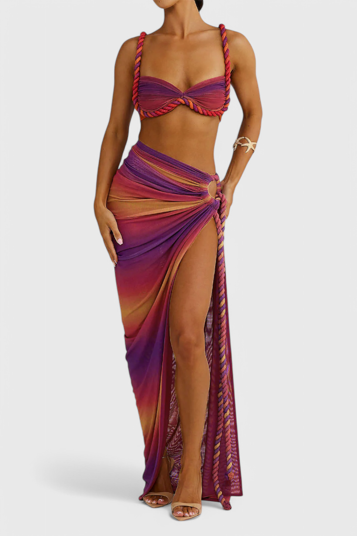 Vibrant et accrocheur, cet ensemble de jupe est conçu pour se démarquer avec son doux mousseline plissée, sa délicate broderie et ses tons dégradés de rêve. Il offre une sensation légère et aérienne qui se déplace merveilleusement avec vous. Parfait pour des sorties printanières, des vacances ou des événements au soleil.